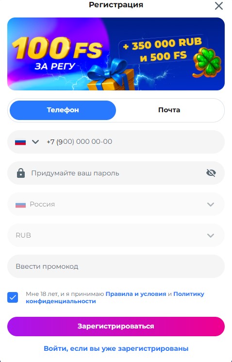 Регистрируйся и получай бонус до 350 000 ₽ + 600 фриспинов